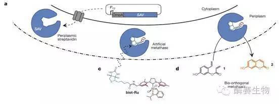 根據這篇文章報道,作者合成人工輔酶(以釕為中心的催化劑分子衍生的生物素,Biot-Ru),再將此人工輔酶與鏈霉親和素(Streptavidin,SAV)結合而形成了人工金屬輔酶。這種方法依賴(lài)于鏈霉親和素與生物素的高親和力,間接把帶有釕催化劑的生物素衍生物引入蛋白質(zhì)。 通過(guò)周質(zhì)蛋白表達以及外置的人工輔酶,作者成功在活細胞內實(shí)現有機金屬酶的正常運作。
