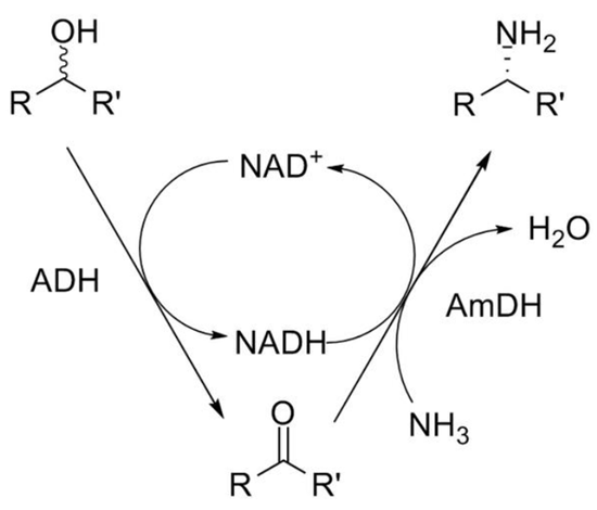 尼古拉斯·特納教授和他的同事,上個(gè)月在《Science》上發(fā)表了他們最新的研究結果,是一種醇脫氫酶(ADH)和氨脫氫酶的組合,用于將消旋醇轉化為手性氨。此反應在將醇轉換成酮的過(guò)程中生成一個(gè)NADH,而在后續的還原胺化反應中NADH重新變成NAD+。