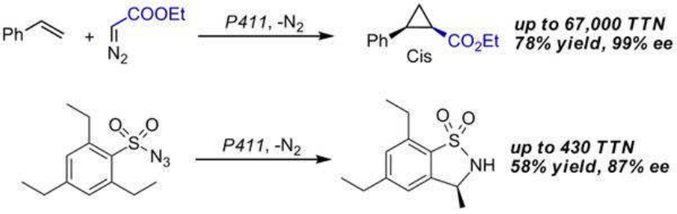 有研究找到了全新的亞鐵血紅素酶催化反應類(lèi)型。由弗朗西斯·阿諾德、佩德羅·科埃略和他們的同事們發(fā)表在Science的一篇文章揭露了這個(gè)驚人的發(fā)現,P450工程酶可以通過(guò)卡賓轉移至烯烴而催化環(huán)丙烷化反應。以重氮作為卡賓的前體,不少的亞鐵血紅素酶可以將烯烴(如苯乙烯)轉化為手性環(huán)丙烷。在重氮乙酸乙酯和苯乙烯反應的過(guò)程中,不同的酶能產(chǎn)生不同程度的立體結構選擇性。通過(guò)巨大芽孢桿菌中的細胞色素P450酶進(jìn)一步研究發(fā)現,通過(guò)對酶的關(guān)鍵結構的突變提高了反應的產(chǎn)率和立體選擇性。苯乙烯上的取代基團可以有多種可能,甚至1-甲基苯乙烯也能夠被酶接受。
