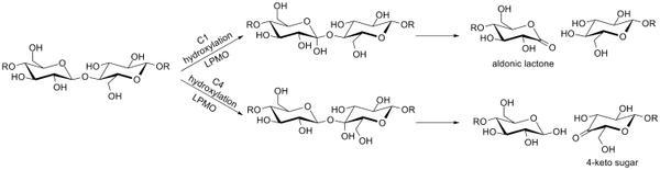 溶解性多糖單氧酶(LPMO)是一種在真菌和細菌中都存在的金屬酶。幾個(gè)晶體結構顯示該種酶包含一個(gè)銅原子和兩個(gè)組氨酸殘基,而一些真菌的LPMO也擁有纖維素結合區域。所有已知的LPMO都含有相對平坦的活性酶結合位點(diǎn)已讓酶與晶體纖維素結合,而此活性位點(diǎn)與水解纖維素酶的溝槽形活性區域相差很大。LPMO將多糖的C1或C4位羥化,而多糖則可以是纖維素、幾丁質(zhì)、或更小的糖鏈。這種羥化作用需要氧氣,以及一個(gè)還原劑以將氧氣分子的第二個(gè)氧原子轉化為水。此還原劑可以是小分子(例如沒(méi)食子酸或者抗壞血酸鹽)或者是纖維二糖脫氫酶。在LPMO的羥化作用下,一個(gè)半縮酮產(chǎn)生并進(jìn)一步導致多糖鏈的裂開(kāi);C1羥基化分裂位點(diǎn)產(chǎn)生了一個(gè)醛糖酸/內酯;C4羥基化產(chǎn)生了一個(gè)4-氧化糖(請見(jiàn)下圖)。